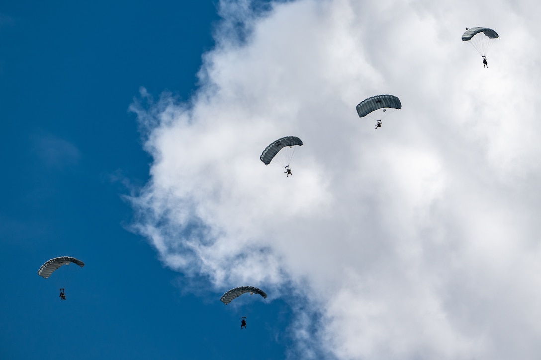 Five combat controllers from the Kentucky Air National Guard’s 123rd Special Tactics Squadron parachute into Barkley Regional Airport in Paducah, Ky., May 13, 2025, from a C-130J Super Hercules aircraft in support of Exercise Grindstone, a three-day earthquake-response scenario staged in the New Madrid Seismic Zone, the most active seismic area in the Eastern United States. The Airmen conducted an assessment of airfield operability and provided air traffic control for follow-on aircraft bringing troops, cargo and equipment needed to establish an aerial port for relief operations. (U.S. Air National Guard photo by Dale Greer)